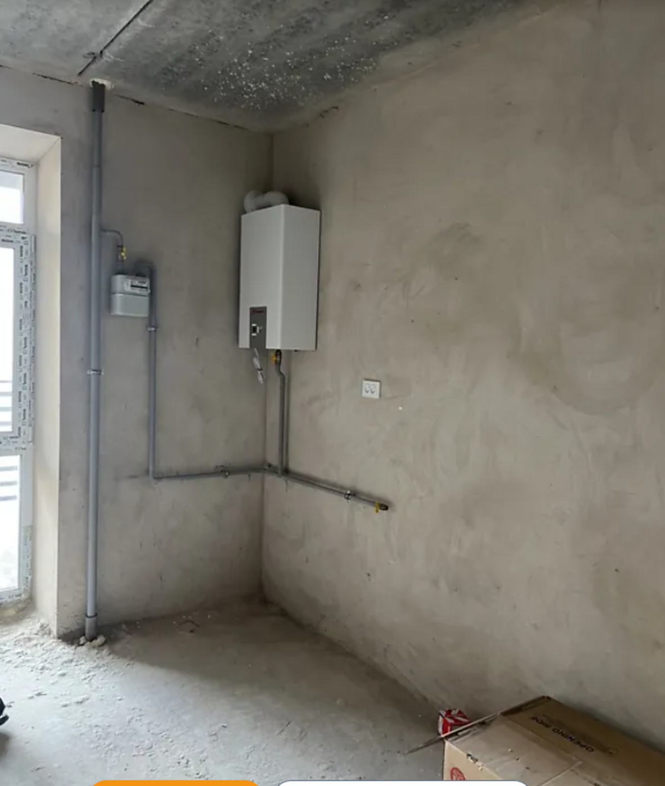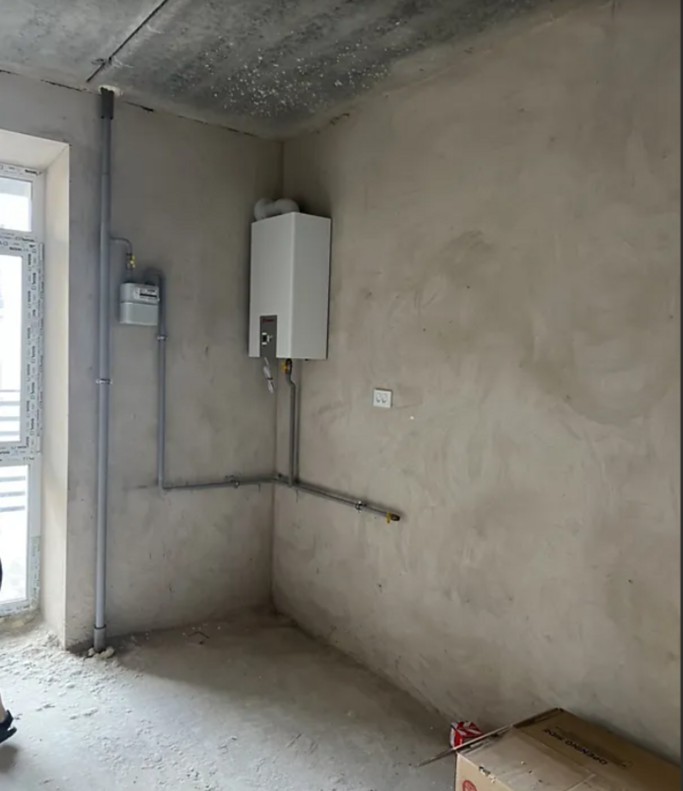 Індивідуальне опалення з двоконтурним котлом, лічильники, чорнова штукатурка,
